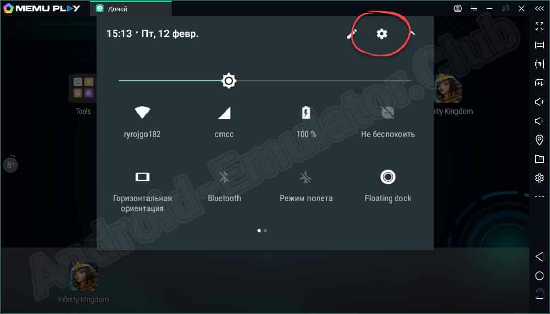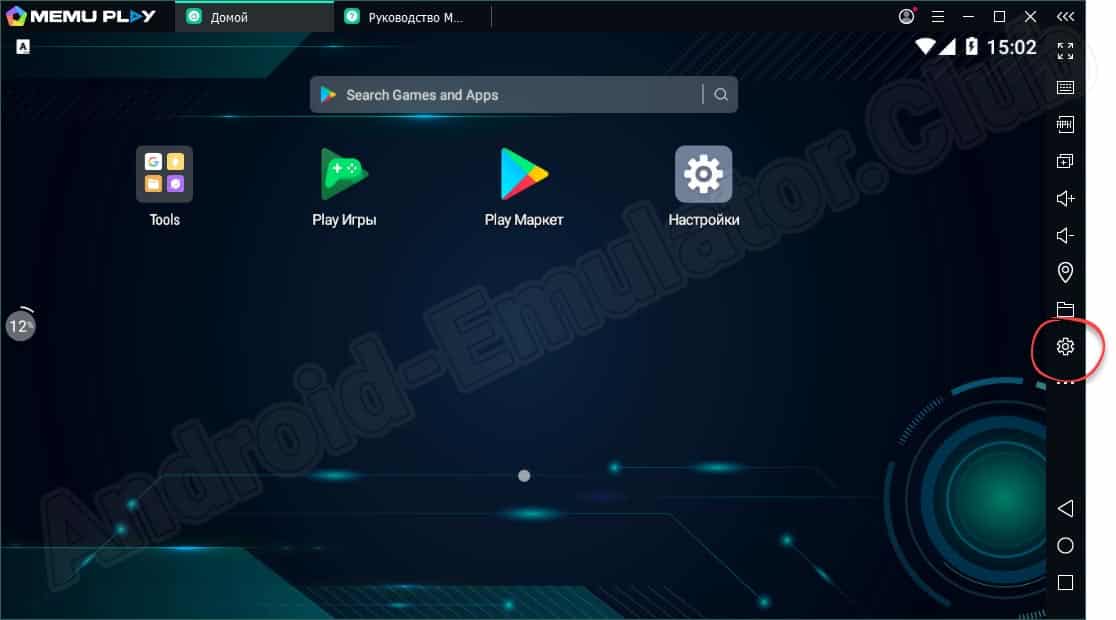 Теперь, когда мы покончили с установкой, можно переходить дальше и разбираться с настройкой эмулятора. Если для мощных компьютеров данная процедура не всегда является обязательной, то на более слабых машинах это обеспечит максимально плавную и стабильную игру без лагов. Открываем настройки, нажав на соответствующую иконку.