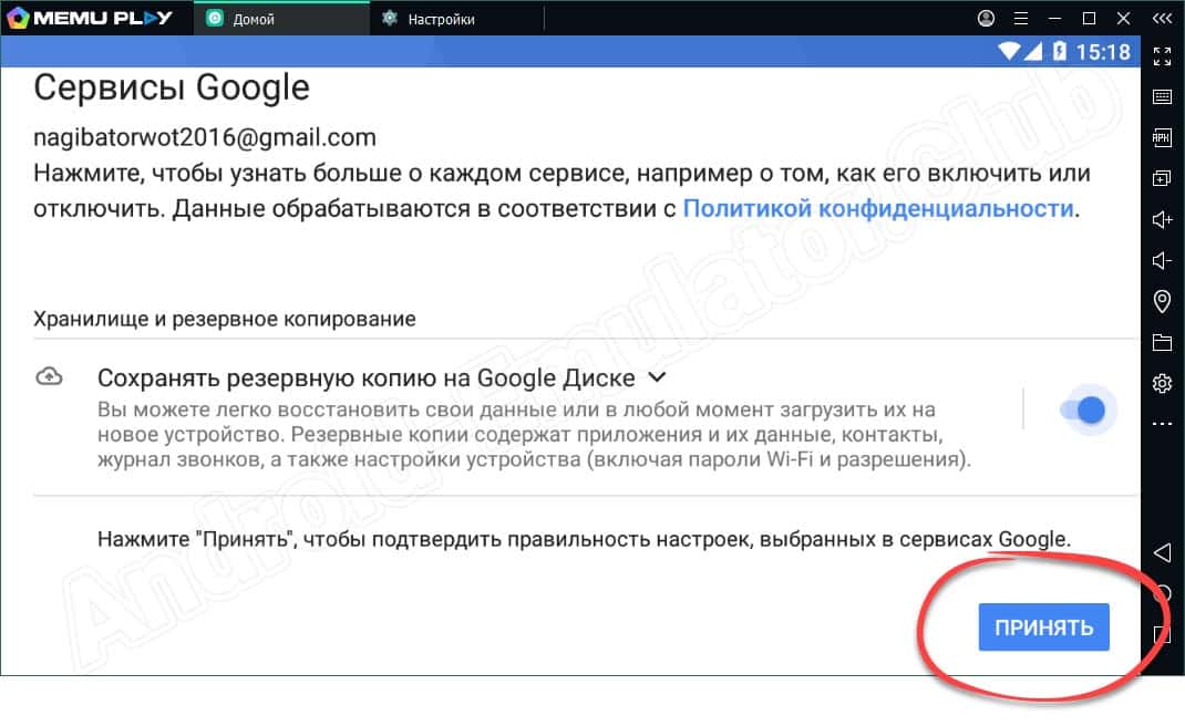 - Также потребуется утвердительно ответить на предложение принятия сервисов Google.