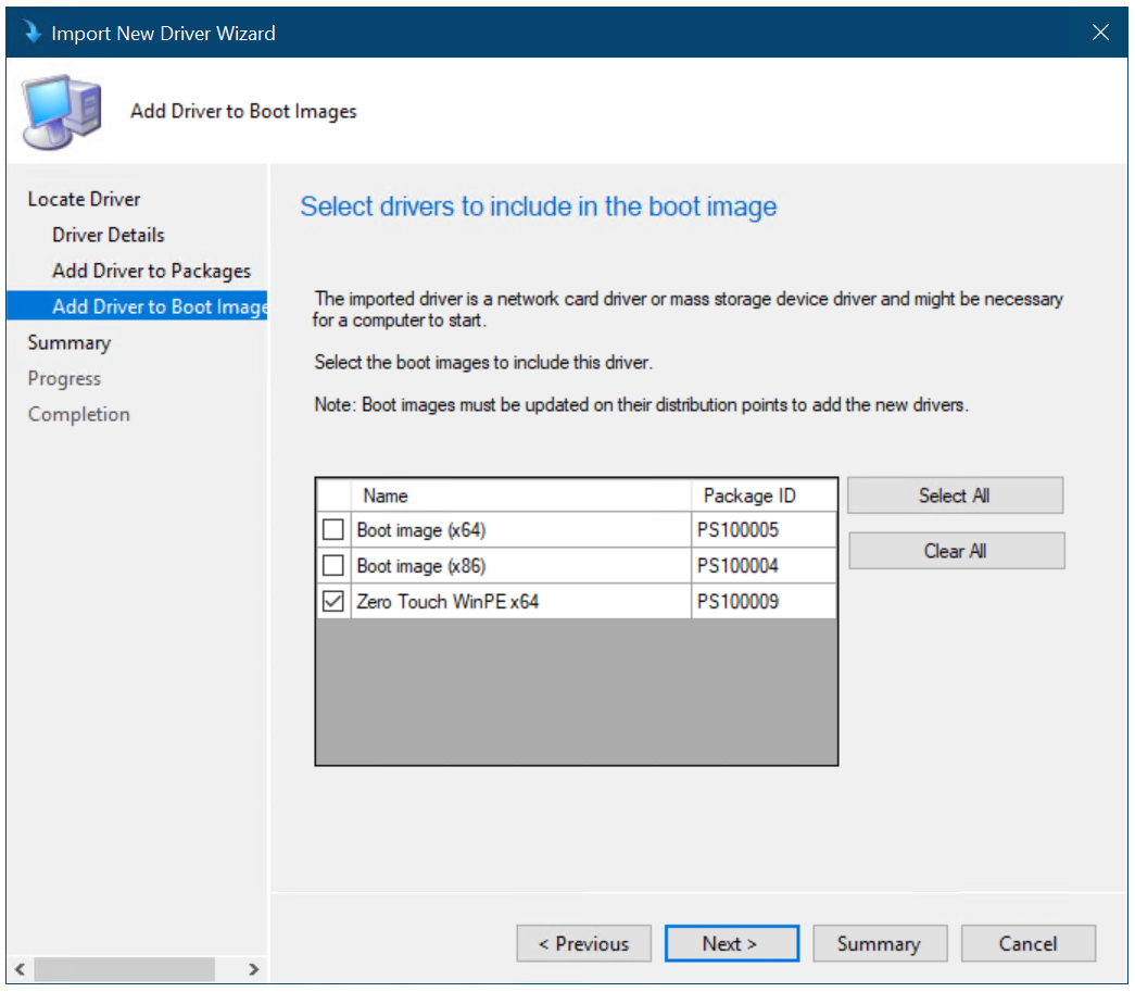 - На странице Выбор драйверов, которые необходимо включить на странице изображения загрузки, выберите изображение загрузки Zero Touch WinPE x64 и нажмите кнопку Далее.
