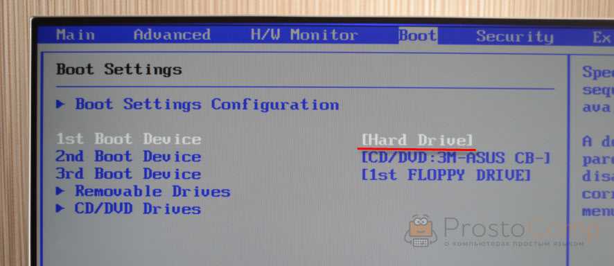 Прежде всего, стоит проверить определяет ли жесткий диск в BIOS. Нужно зайти в уже известный раздел Boot и посмотреть, отображается ли там модель жесткого диска.