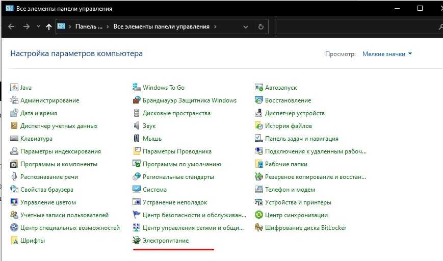 Открыть эту панель можно либо через ярлык (по умолчанию он располагается на рабочем столе), либо с помощью сочетания клавиш Win+R вызвать консоль, после чего ввести в нее «control». Далее нужно найти пункт «Электропитание». Необходимо отметить, что на скриншоте ниже выбраны мелкие значки (изменить их размер можно в верхней правой части окна). Расположение пункта также может варьироваться в зависимости от версии Windows.