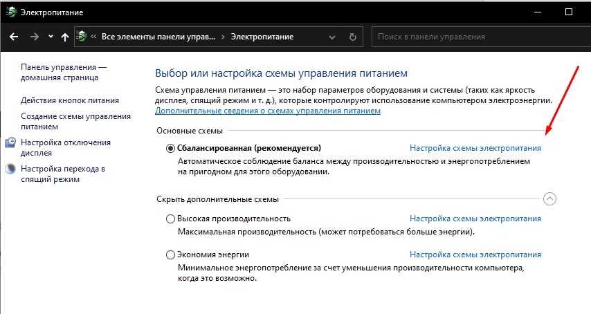 оставить активированной сбалансированную схему и нажать на «Настройку схемы электропитания»;
