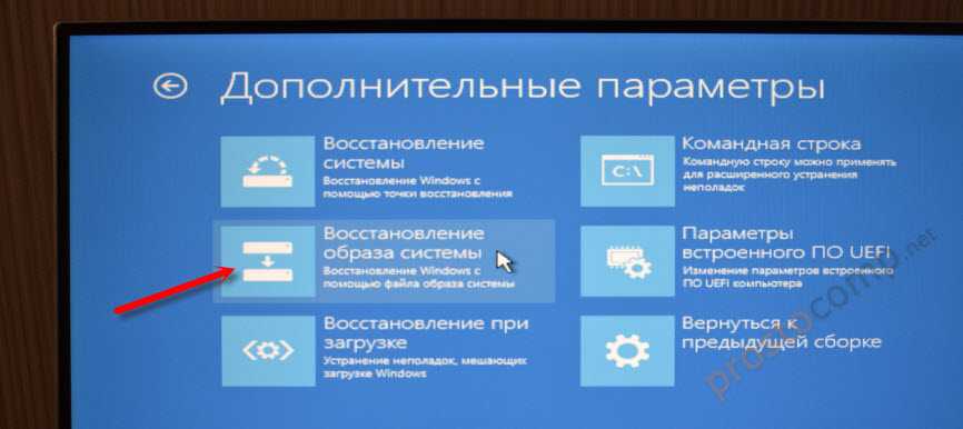 Нажмите «Диагностика», затем «Дополнительные параметры» и выберете «Восстановление образа системы».