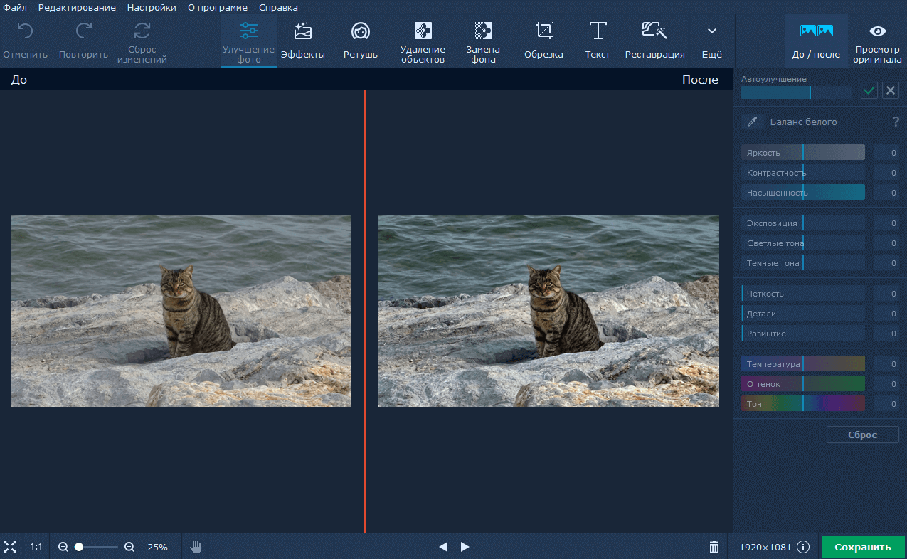Посередине – рабочая область, здесь Вы редактируете фото. Чтобы просмотреть изменения, воспользуйтесь инструментами в правом верхнем углу программы. Нажав «До/после», программа отобразит на экране 2 изображения: до и после. Удерживая кнопку «Просмотр оригинала», на экране будет отображаться оригинал фотографии, что, по-моему, достаточно удобно!