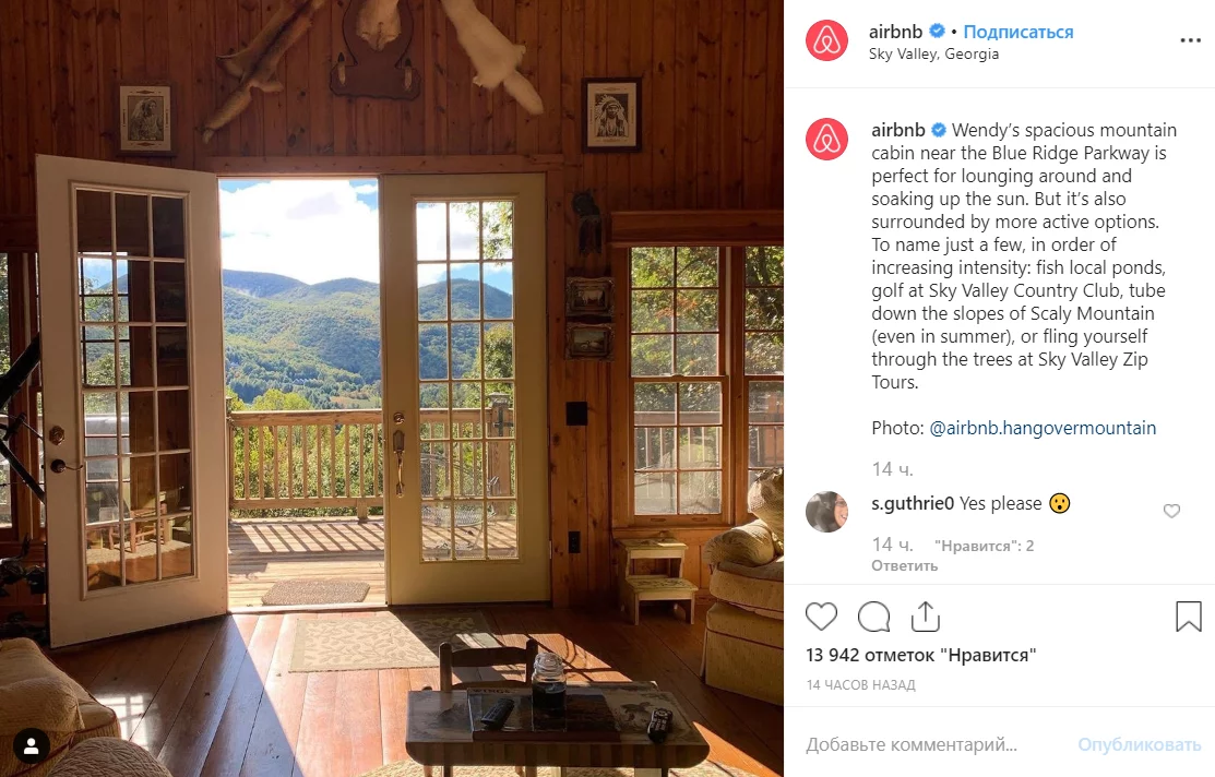 Например, страница Airbnb в Инстаграме практически полностью состоит из клиентских публикаций. В СММ-отделе компании отслеживают посты, помеченные тегом @Airbnb или хэштегом #airbnb. Связываются с клиентами, просят принять правила использования контента, и, наконец, размещают пост в соцсетях.