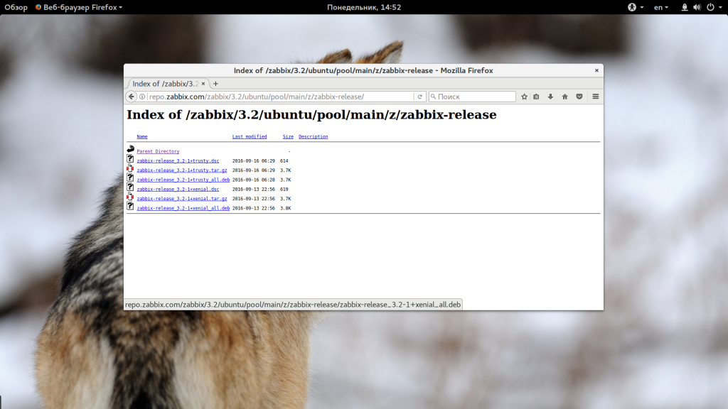 Если у вас другая операционная система, посмотрите список файлов на сервере через браузер и выберите нужный установщик. Затем установка zabbix 3.2 на Ubuntu: