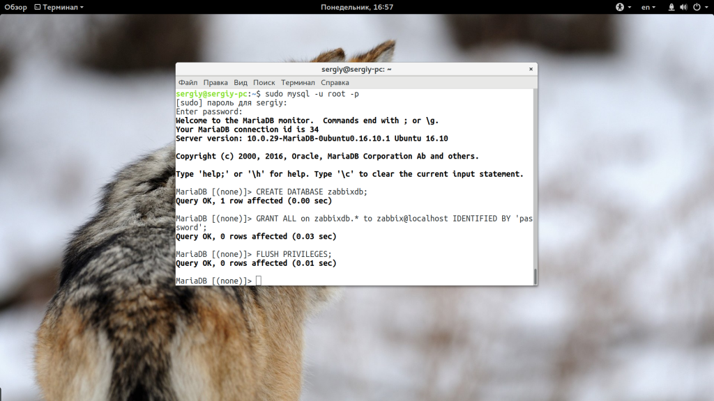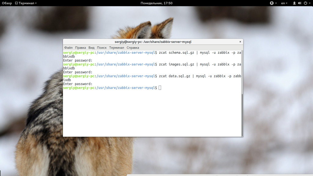Для нормальной работы Zabbix нужна кодировка базы данных UTF-8, если вы создадите базу в кодировке utf8mb4, то получите ошибку: “Specified key was too long; max key length is 767 bytes”. Дальше нужно загрузить все таблицы в базу данных, они находятся в папке /usr/share/zabbix-server-mysql/. Вместо zabbix и zabbixdb нужно указать своего пользователя и имя базы данных: