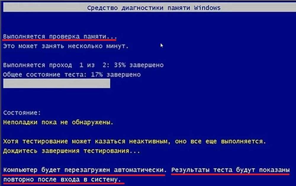 В обоих описанных вариантах после перезагрузки компьютера появляется рабочее окно инициированной проверки памяти, на котором подчёркнута красным самая важная информация.
