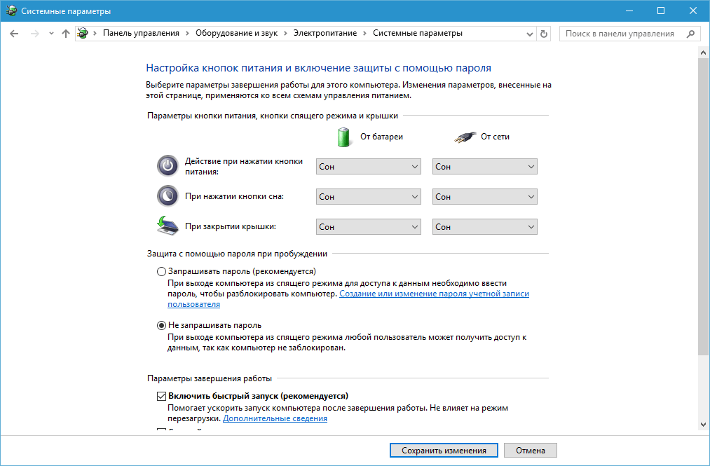 - Нажмите «Запрос пароля при пробуждении», затем «Изменение параметров, которые сейчас недоступны» и отметьте флажком опцию «Не запрашивать пароль».