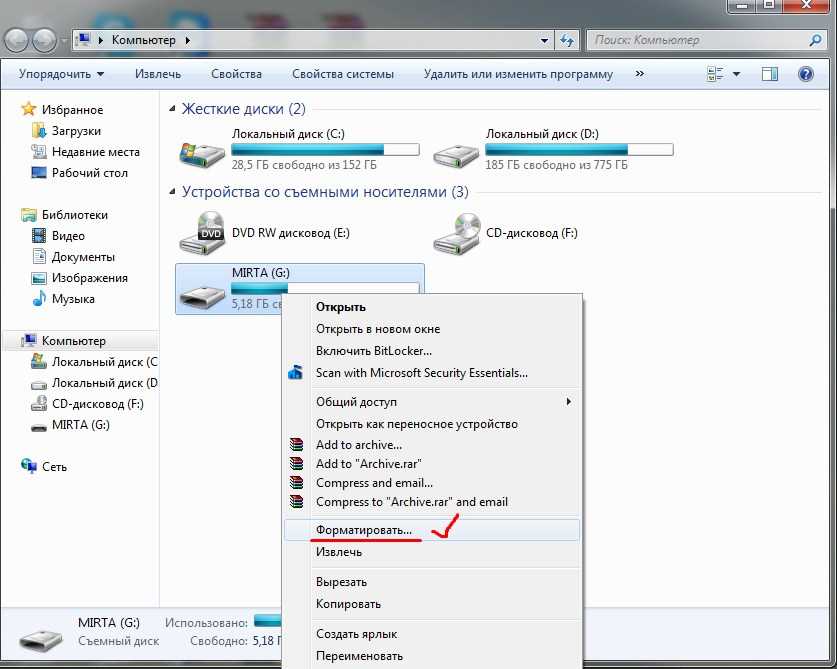 - Далее можете отформатировать его, если не сделали того ранее. Флешка должна быть в