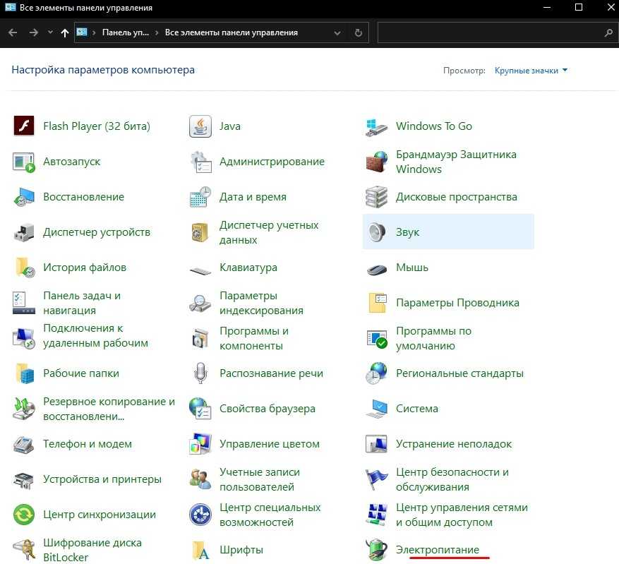 Если вдруг в списке вариантов завершения работы не будет строки «Сон» или «Спящий режим», необходимо выполнить следующие действия. Сначала открываем Панель управления и переходим в раздел «Электропитание».