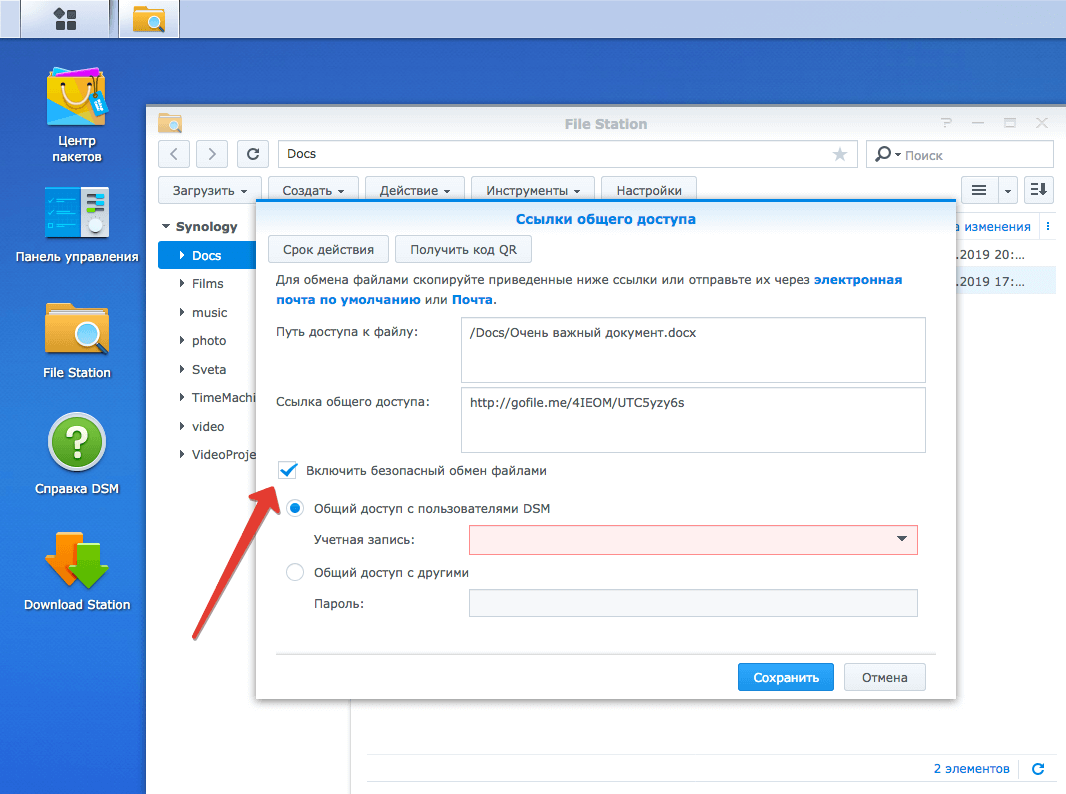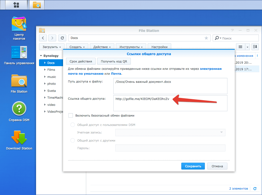 Обмен файлами на файловом хранилище с помощью службы QuickConnect