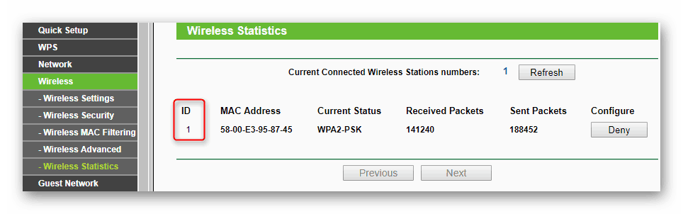 Для того, чтобы узнать, сколько клиентов подключено на данный момент к вашему устройству, необходимо зайти в панель управления роутером во вкладку «Wireless – Wireless Statistics». В таблице значение ID показывает порядковый номер устройства, подключенного в сеть: