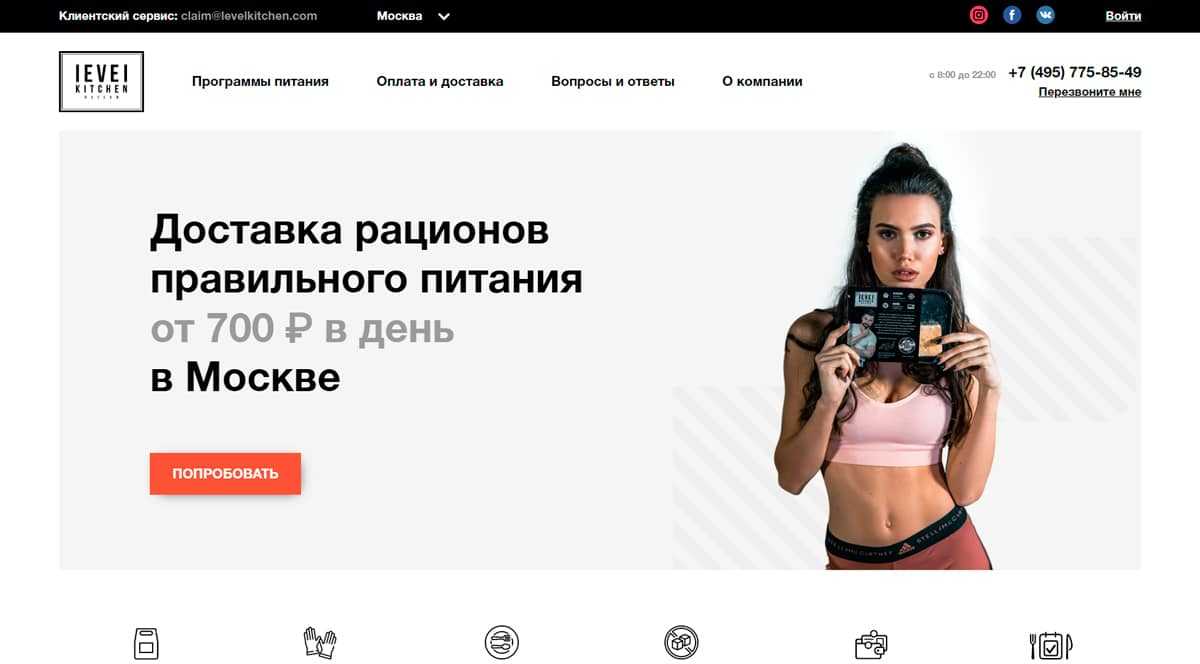 Достигнуть стройной фигуры легко, зайдите в каталог и закажите набор еды на неделю или месяц. Курьеры Level Kitchen привезут рацион в удобный временной интервал с 6 до 12 часов утра. К каждому набору прилагается печатное меню с калорийностью и БЖУ готовых блюд, поэтому вам легко будет держать под контролем сбалансированность рациона. Это первое место в рейтинге лучших доставок ПП еды на дом в 2021 году.