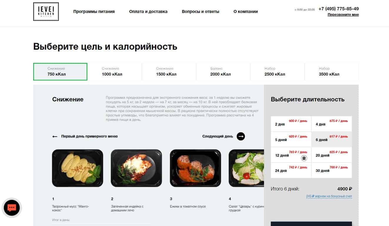 Доставка правильного питания Level Kitchen в Москве работает для людей, которые хотят следить за здоровьем и поддерживать стройную фигуру. В зависимости от преследуемой цели, выберите нужный рацион: 1000, 1500, 2000, 2500, 3500 кКал в день. Для экстренного снижения веса подойдет программа на 750 кКал с преимущественно белковым наполнением.