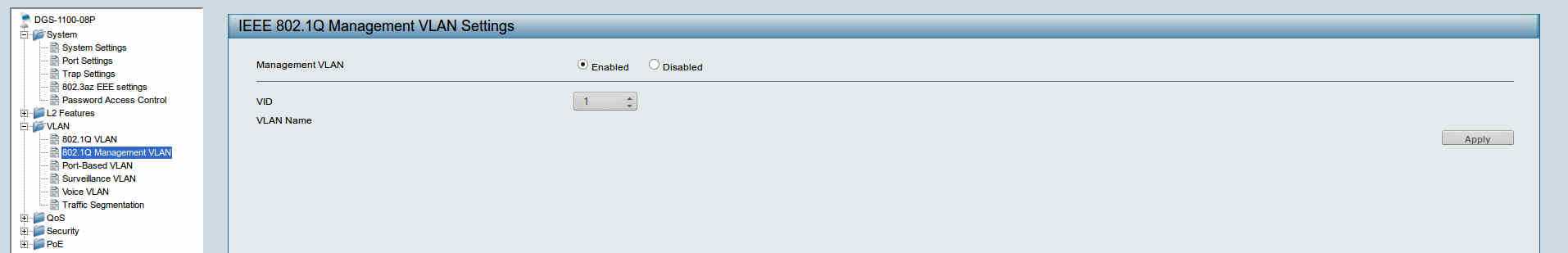 Укажем, что в дальнейшем управлять D-Link DGS-1100-08P (IP 10.90.91.2) можно управлять только через vlan1, то есть в нашем случае системный администратор должен подключиться в первый порт DGS-1100-08P(При подключении в иной порт – коммутатор не разрешит доступ к 10.90.91.2).