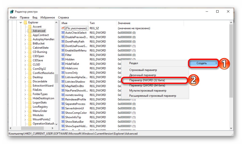 - Когда мы дошли до конечной точки директории (открыли папку Advanced), прокручиваем до конца список в правой части экрана и щёлкаем правой клавишей по свободному полю внизу — выбираем действие создания, а в меню — параметр в формате DWORD.