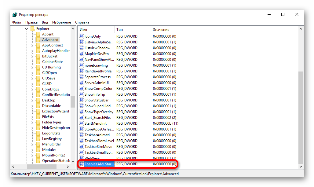 - В дереве каталогов найдите EnableXAMLStartMenu. Если подробней, то путь таков: HKEY_CURRENT_USER — SOFTWARE — Microsoft — Windows — CurrentVersion — Explorer — Advanced. Если у вас что-то не получилось из выше описанного, не расстраивайтесь, из видео в конце записи вы, скорей всего, поймете лучше.