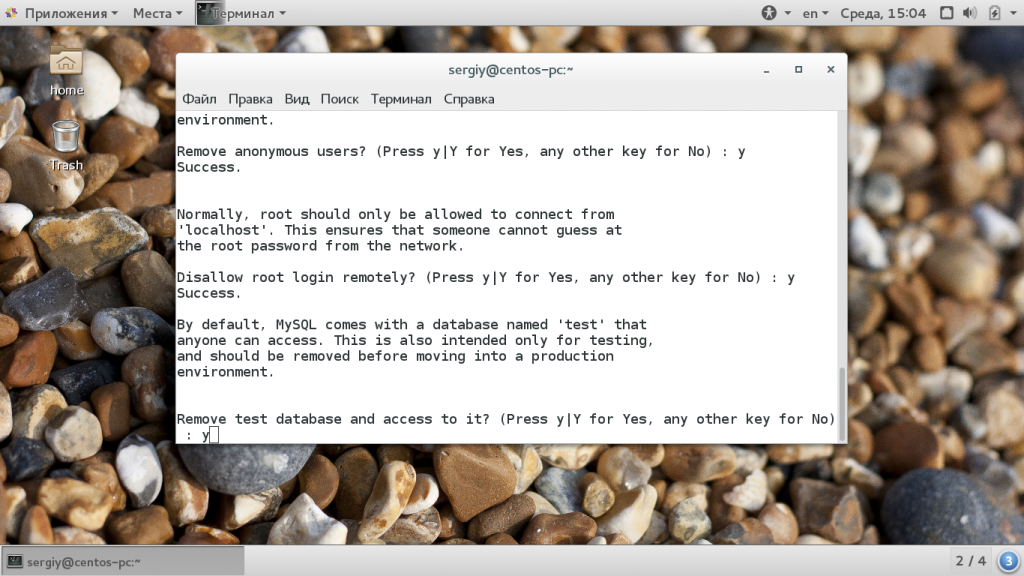 После этого сценарий задаст вам ряд вопросов. Чтобы принять данные по умолчанию, можете просто нажать Y и Enter. Сценарий заблокирует анонимных пользователей и удалённый root логин, удалит тестовые таблицы и перезагрузит привилегии.