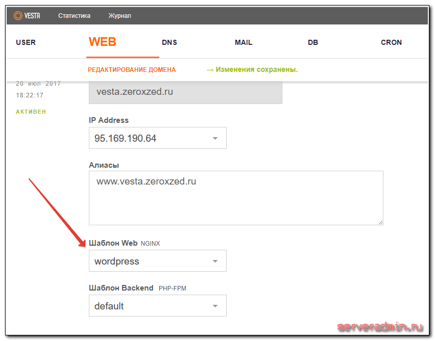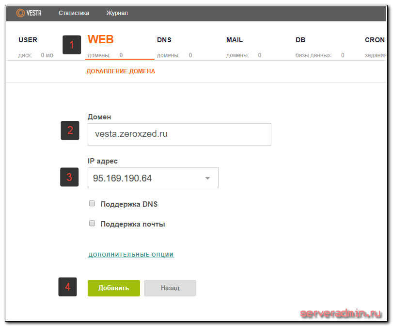 Я создам для него сайт на основе моего служебного домена — vesta.zeroxzed.ru. Не забудьте настроить dns запись на dns хостинге для нового домена. Для проверки корректной работы панели, я на этот сайт установлю wordpress.