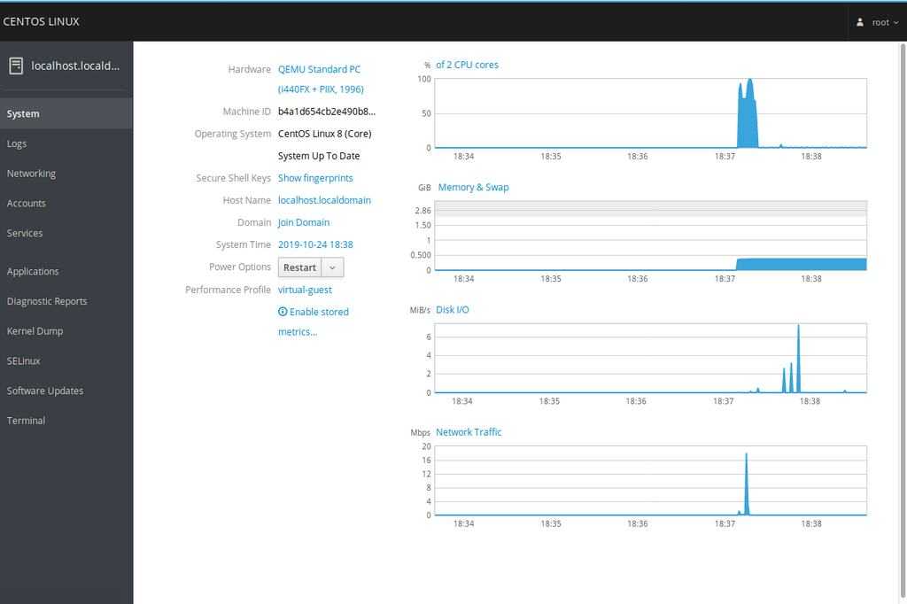 Возможность видеть наглядно все основные параметры системы и иметь возможность ими управлять пожалуй самая приятна новость которая меня порадовала в выпуске CentOS 8.