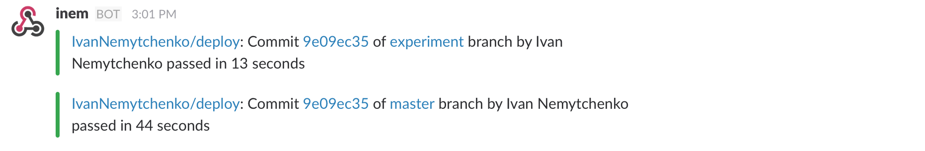 Идея! Используем Slack для оповещений о развертываниях, чтобы никто не пушил новые изменения, пока старые не закончили развертываться.