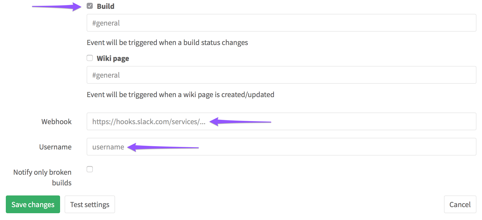 … и передать его в Settings > Services > Slack вместе с вашим логином Slack:
