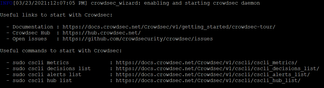 На этом установка CrowdSec закончена. В конце вы увидите список основных cli команд для взаимодействия с локальной службой.