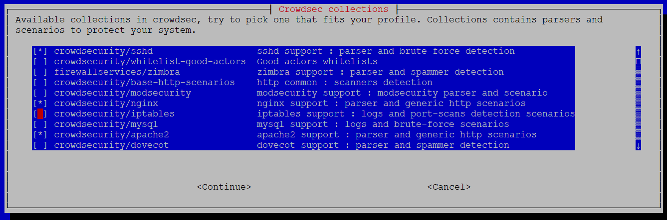 После того, как службы и связанные файлы журналов будут правильно идентифицированы (что очень важно, поскольку именно отсюда CrowdSec будет получать информацию), мастер предложит коллекции. Все коллекции основываются на нашем видении того, как и по каким направлениям стоит защищать систему (то есть никто не запрещает вам заняться ручной конфигурацией периметра, это просто костыль быстрой настройки).