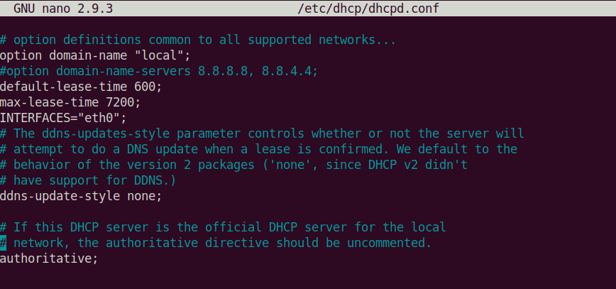 sudo nano /etc/default/isc-dhcp-server