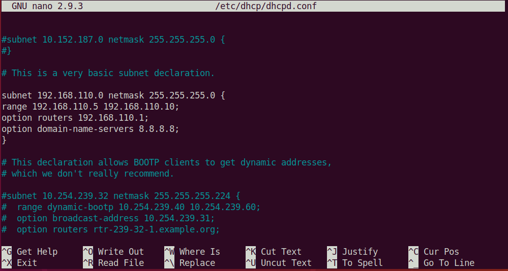 $ sudo nano /etc/dhcp/dhcpd.conf