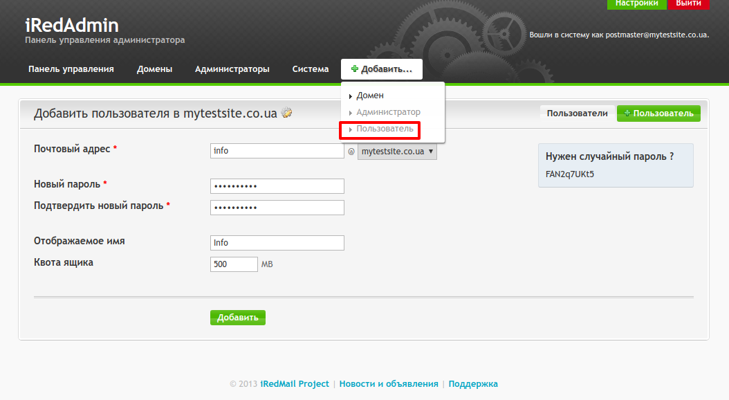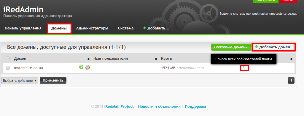 О том как добавить свой первый почтовый ящик в iRedMail читайте в нашем FAQ.