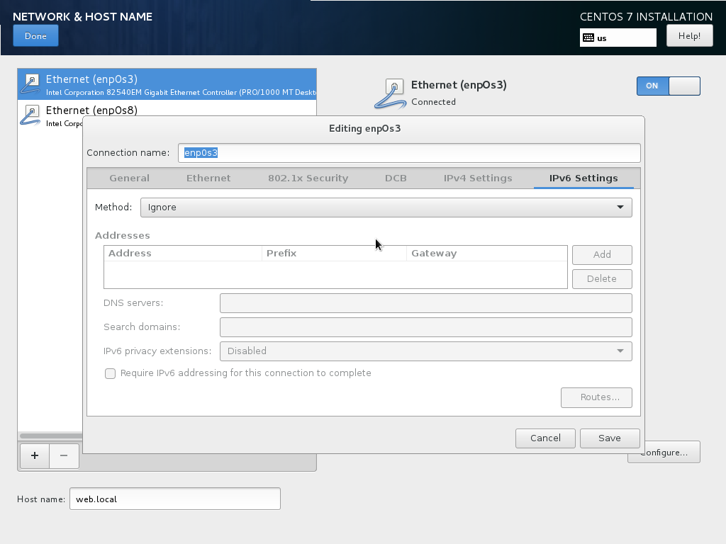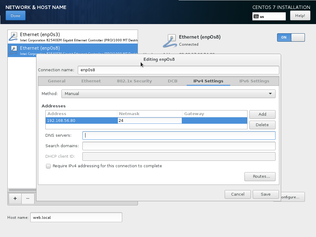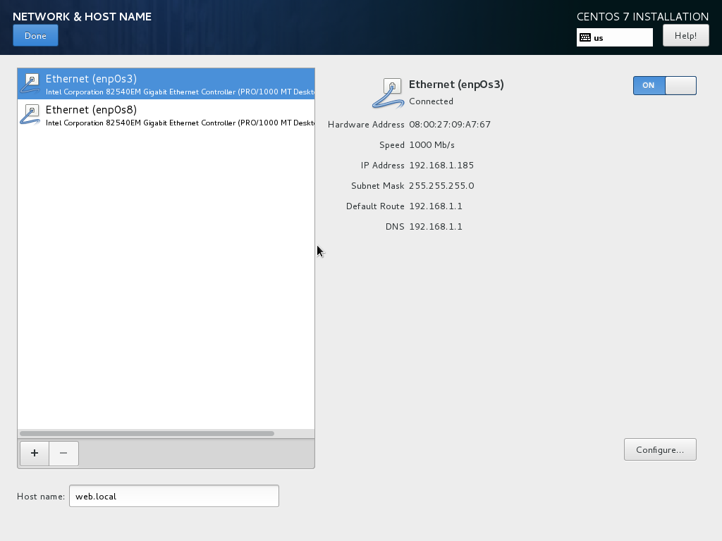 Переходим к настройке сетевых интерфейсов. Нажимаем NETWORK&HOST NAME и переходим к окну конфигурации. Первым делом задайте hostname для вашего сервера – у меня это web.local, вы можете повторить за мной или же написать все что хотите.