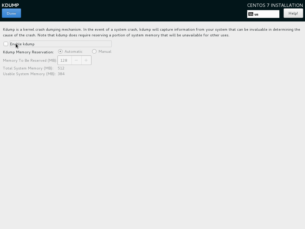 Отключим механизм сбора информации о сбоях ядра KDUMP. Заходим в КDUMP, снимаем галочку с “Enable kdump” и нажимаем “Done”.