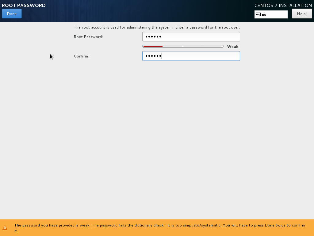 Обратите внимание – если задали пароль, который установщик посчитал слабым – то на кнопку “Done”, надо будет нажать два раза. На общедоступных серверах такие пароли конечно же ставить нельзя, но в рамках нашей задачи с паролем можно особо не мудрить