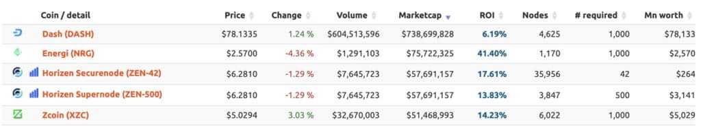 Более конкретную информацию по получению доходов от мастерноды можно получить на сайте masternode.online. Сервис показывает данные по монете: ее цена, капитализация, объем торгов, возврат инвестиций (ROI), число нод и число монет, необходимых для участия в ставке.