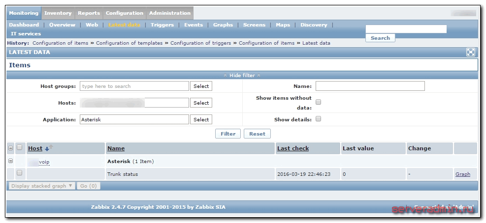 Для сбора данных все готово. Теперь назначаем шаблон серверам с астериском, где мы подготовили агенты мониторинга и скрипты и ждем поступления данных. Проверять как обычно идем в Latest data. Через пару минут должны поступить значения.