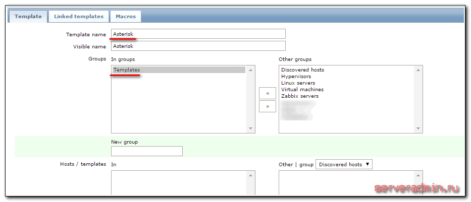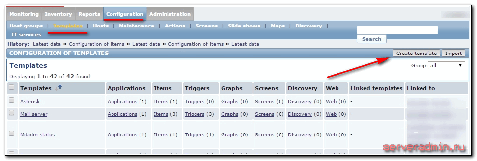 Нам нужно создать шаблон на сервере, для назначения его серверам с астериском. Здесь ничего сложного, делаем все то же самое, что мы делали ранее, настраивая мониторинг рейда mdadm. Идем в раздел Configuration -> Templates, нажимаем Create template.