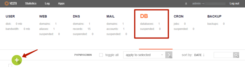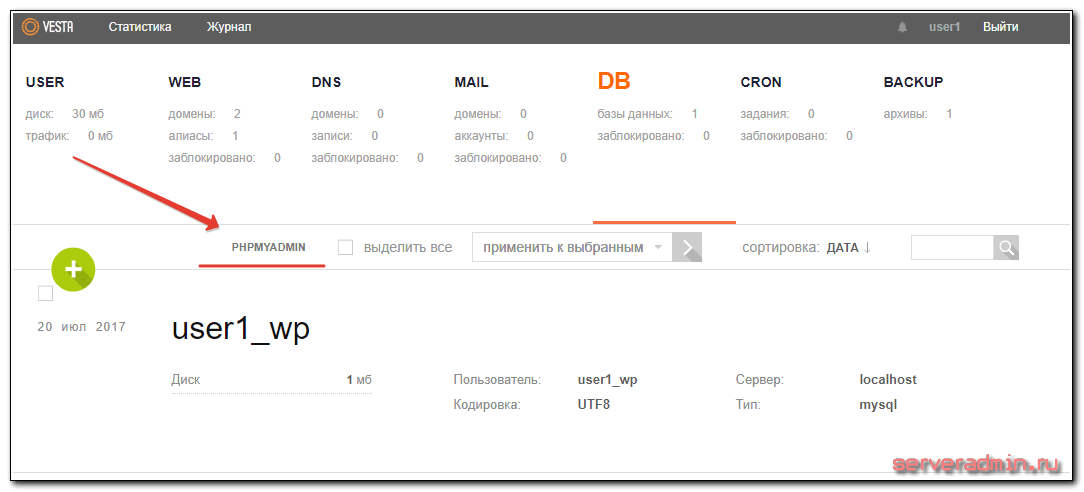 Для начала напомню, как в vestacp зайти в phpmyadmin. Я не сразу нашел соответствующую ссылку. Она в разделе DB.