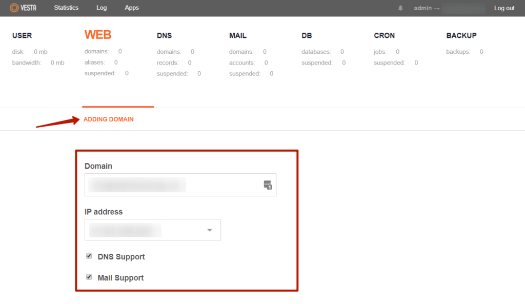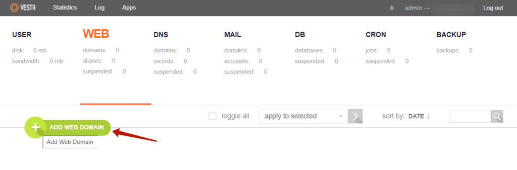 Новый пользователь готов. Залогиньтесь под ним и перейдите в раздел WEB и нажмите плюсик для добавления нового домена на сервер (фактически, создание нового сайта):