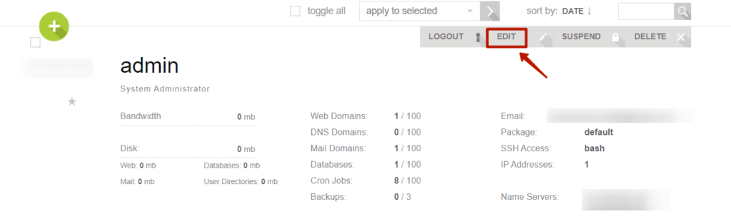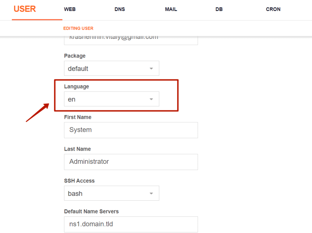 Далее перейдем в настройки своей учетной записи (admin) и при желании выставим язык интерфейса, на котором будет отображаться Vesta-панель, а также другие настройки, например доступ по SSH – поставим bash: