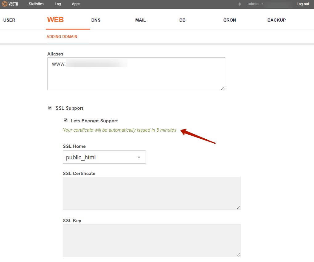 Алиасы и директорию оставляем по умолчанию, а SSL включаем и ждем 5-10 минут. За это время Веста сгенерирует ключи SSL.