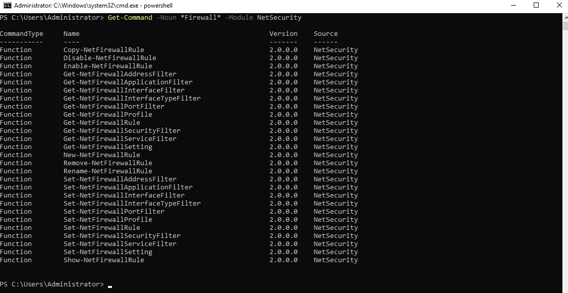Advanced Firewall — это расширенные настройки сетевого экрана на основе правил. Как и все остальное, их можно настраивать через PowerShell. Чтобы увидеть доступные команды для управления сетевым экраном, выполним следующий командлет с параметрами: