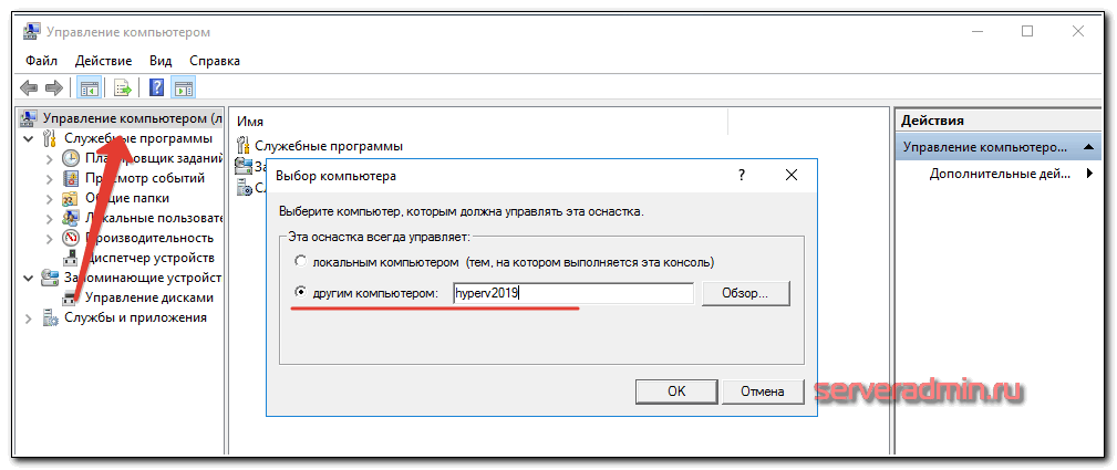 Самое трудное сделали. Теперь мы можем свободно подключаться и управлять гипервизором. Забыл упомянуть о том, как подключиться к управлению самим сервером, то есть как посмотреть список дисков, службы, почитать логи и т.д. Делается это очень просто. Заходите на компьютер под той же учетной записью, что является администратором на гипервизоре. Запускаете стандартную оснастку «Управление компьютером», выбираете локальный компьютер, жмете правой правой кнопкой мыши и выбираете подключиться к другому компьютеру: