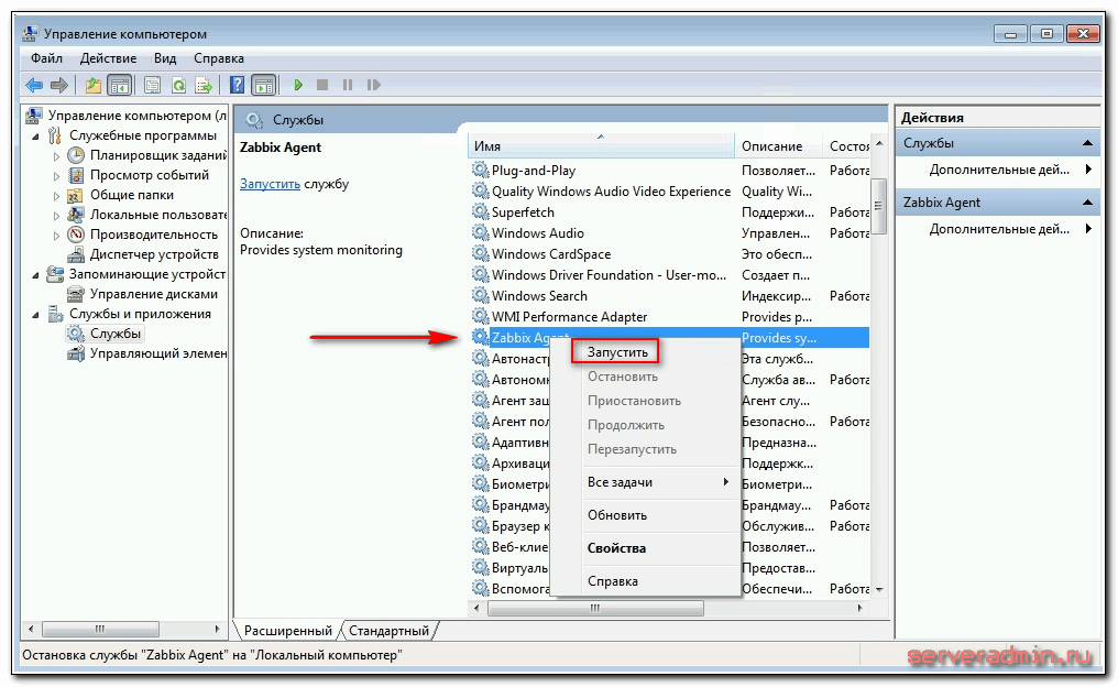 Теперь открываем оснастку со службами, ищем службу с именемZabbix agentи запускаем ее.