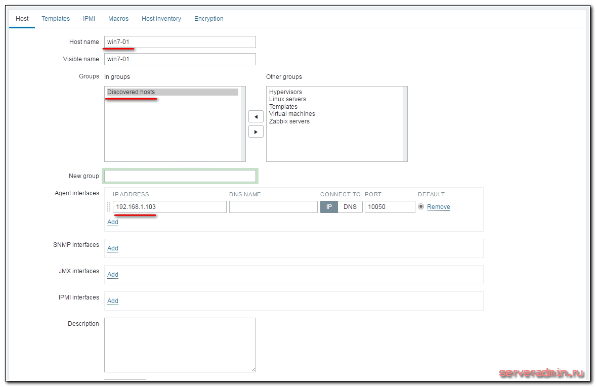 На первой вкладке указываем имя хоста, такое же, как на клиенте, добавляем в любую существующую группу и задаем ip адрес компьютера.