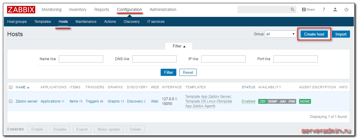Чтобы работал мониторинг windows машины, нужно добавить на сервер мониторинга host с таким же hostname, что мы указали в конфиге агента. Для этого идем в web панель, открываем разделConfiguration -> Hostsи жмемCreate host.