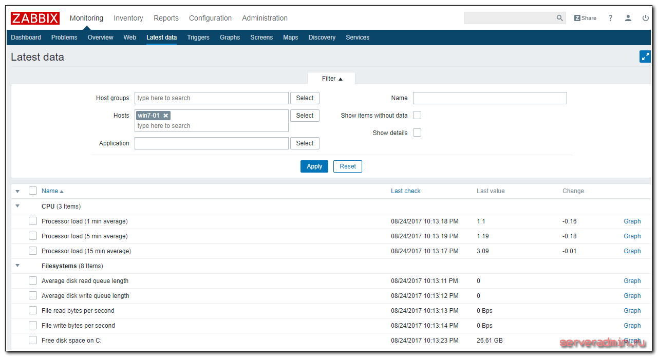 В этом разделе отображаются последние данные, которые пришли на сервер по выбранным хостам или группам хостов.