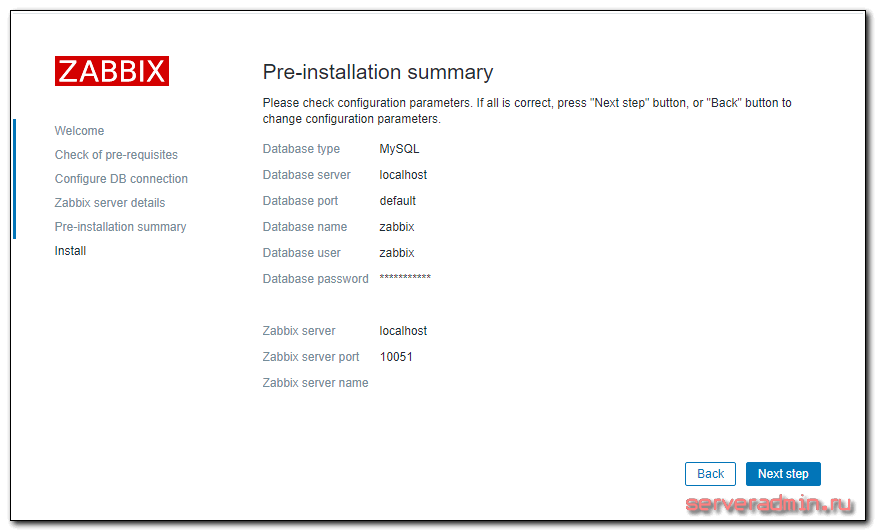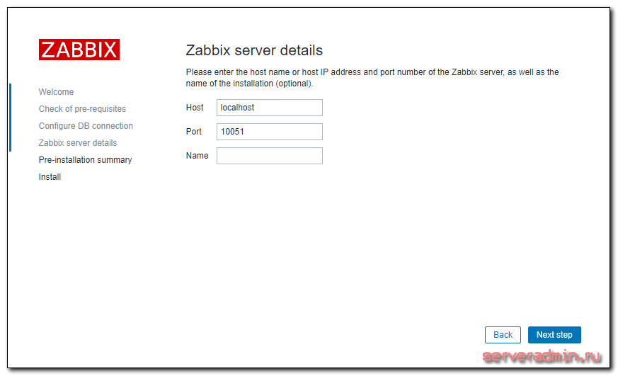 Имя не является обязательным; оно используется в веб – интерфейсе, чтобы отличить один сервера от другого в случае, если у вас есть несколько серверов мониторинга. Нажмите Следующий шаг, чтобы продолжить.