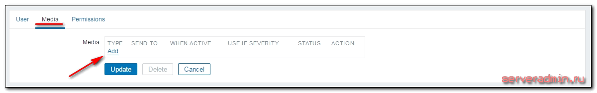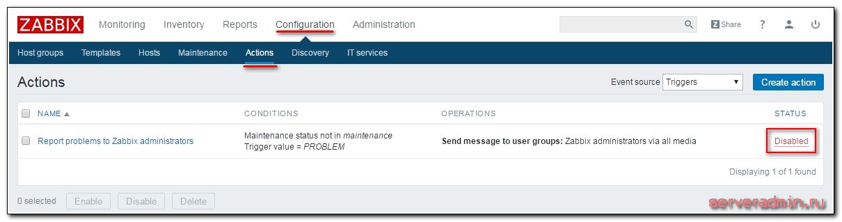 ЖмемAdd, затемUpdate. Дальше нужно активировать отправку уведомлений по событиям. Для этого идем вConfiguration -> Actionsи жмем наDisabled, чтобы она сталаEnabled.